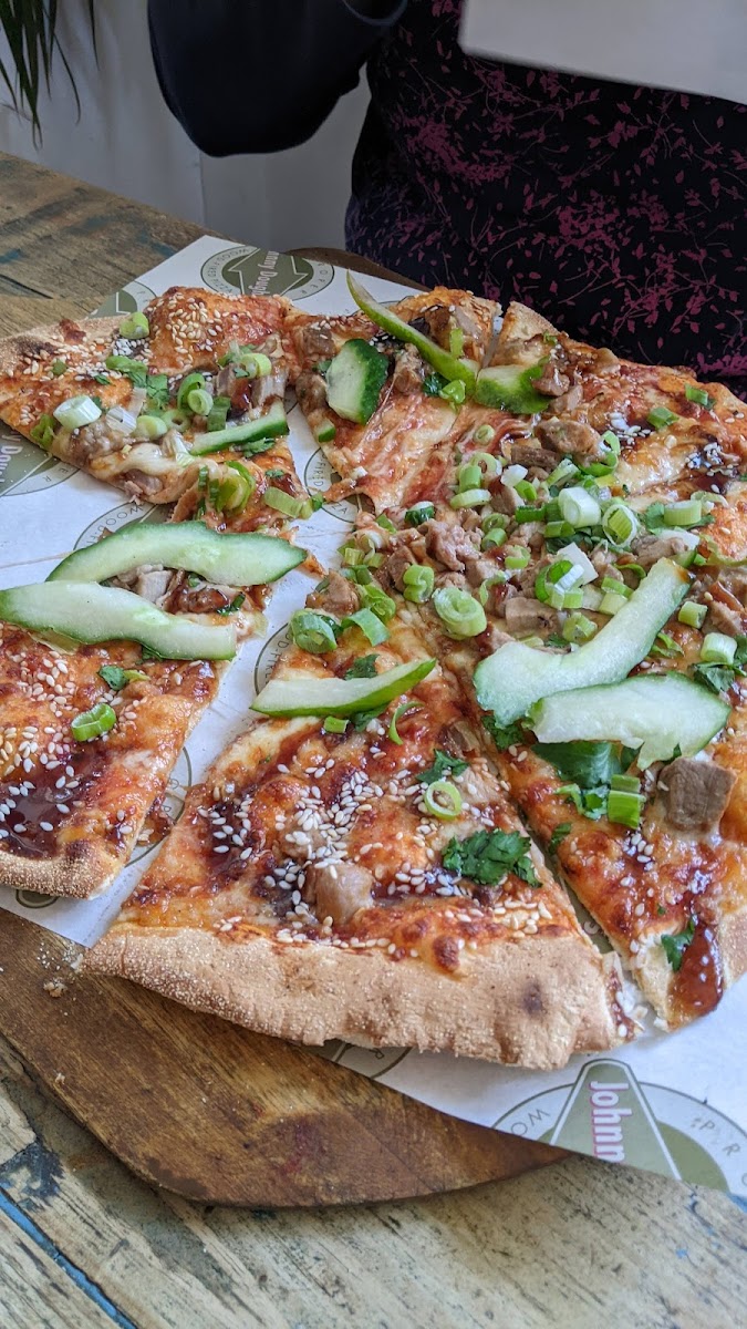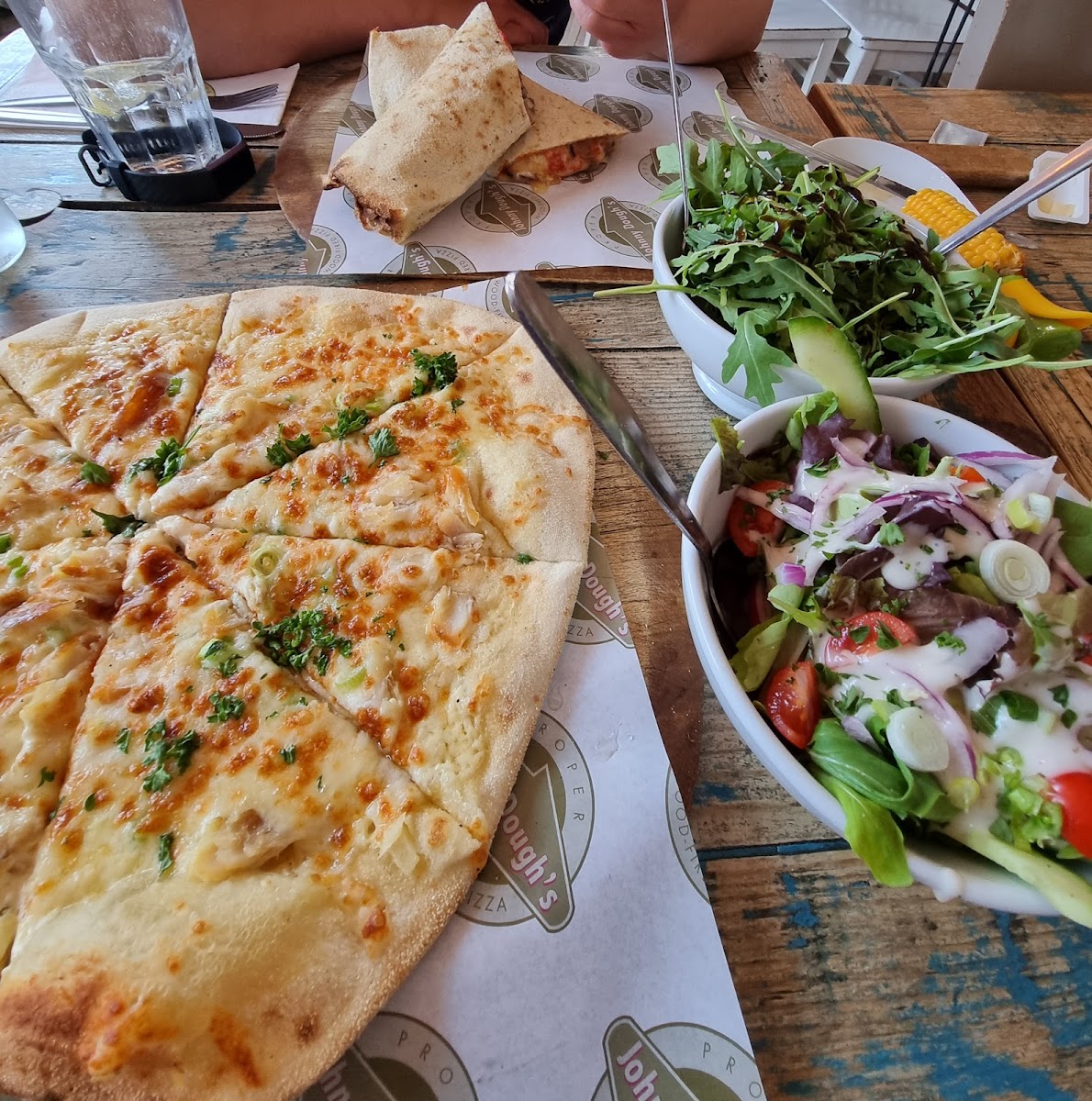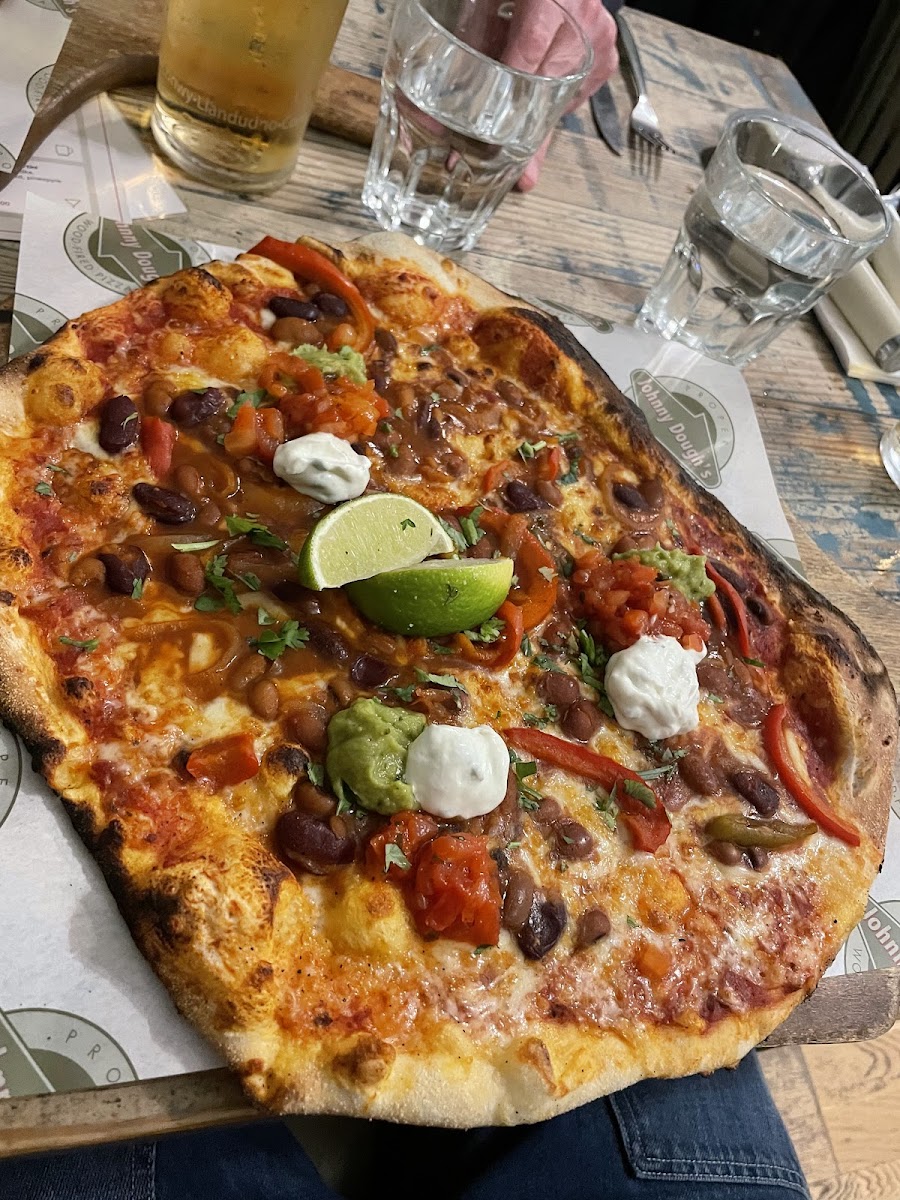 One of the key highlights of Johnny Dough's At The Bridge is its diverse and mouthwatering menu, which caters to a variety of tastes. Whether you're in the mood for something meaty, vegetarian, or vegan, there's something to please every palate. Signature dishes like the Johnny's Meaty Special Pizza, loaded with savory toppings, and the Fajita Veggie Pizza, are sure to leave a lasting impression. The Chicken Tikka Pizza offers a unique spin on a classic, while the Goat’s Cheese Pizza delivers a creamy and tangy option for cheese lovers. For those seeking a more traditional flavor, the Smoked Haddock and Sheep Shish Kebab are excellent choices.